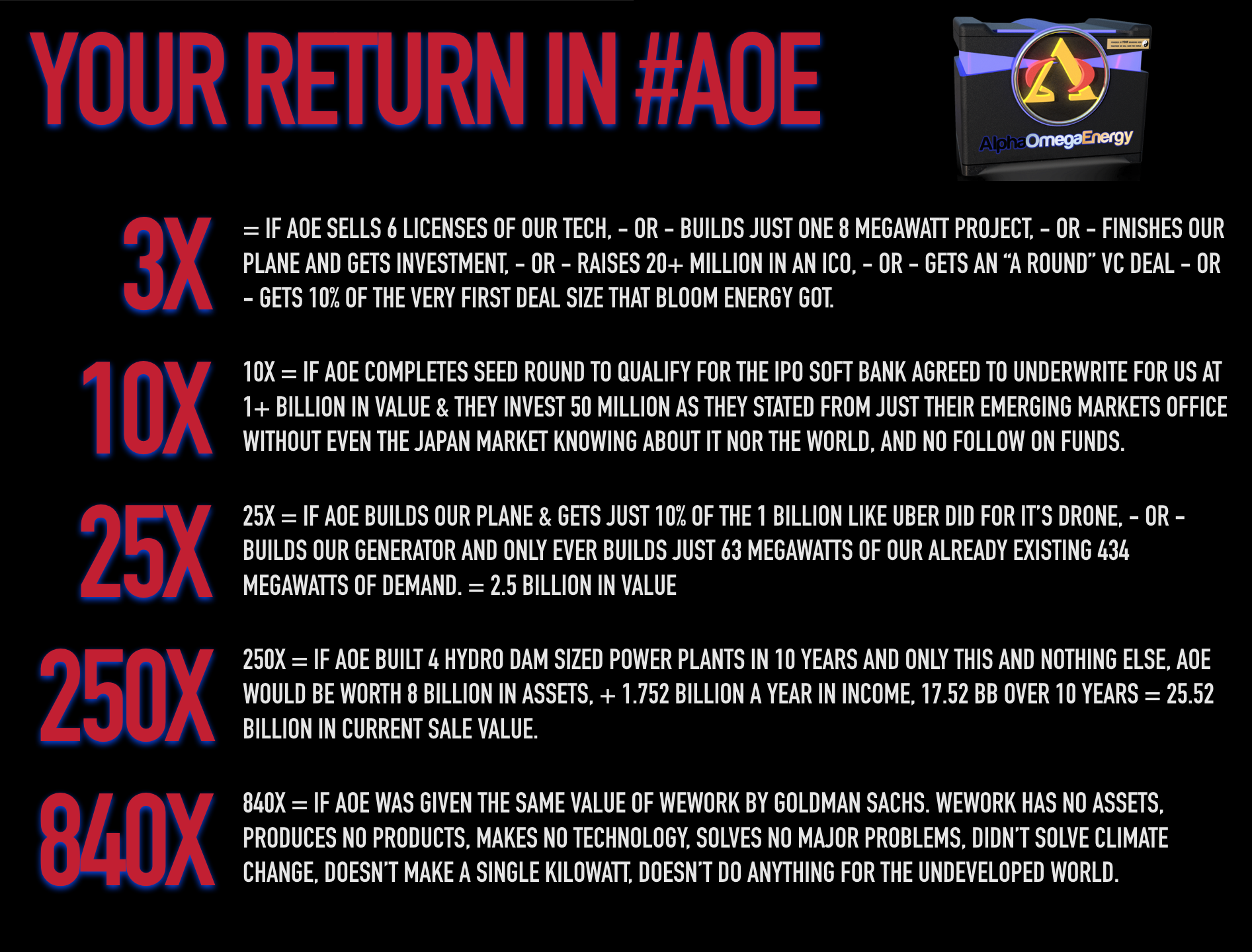 | We Power Blockchain AlphaOmegaEnergy is commercializing by powering our internal Blockchain processing Data Center which we built already from our angel investor funds given to us by Bitcoin traders. AOE has the #1 Clean power & energy efficiency solutions in the world for Blockchain allowing us to run more profitably than any other Blockchain processors on earth by far. AOE will scale this build out of both Power plants & Data centers continually into the Blockchain World commerce future, earning our investors significant above market returns. (click for more) |